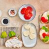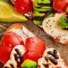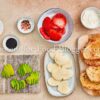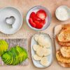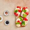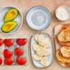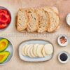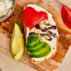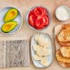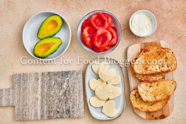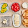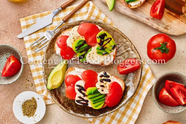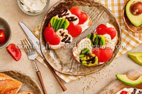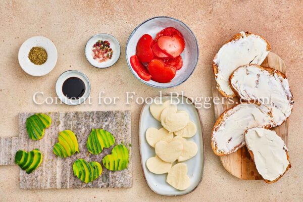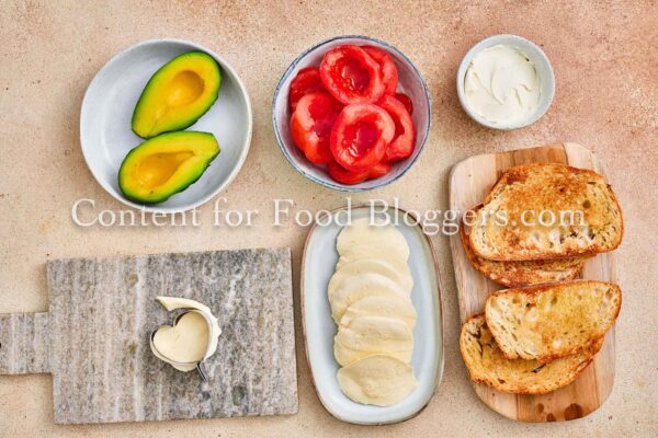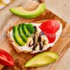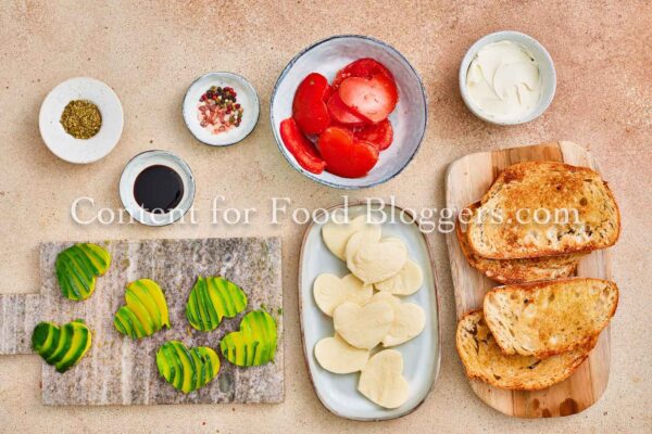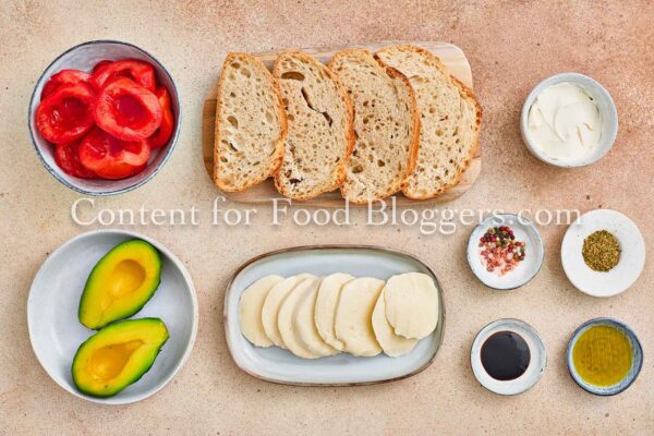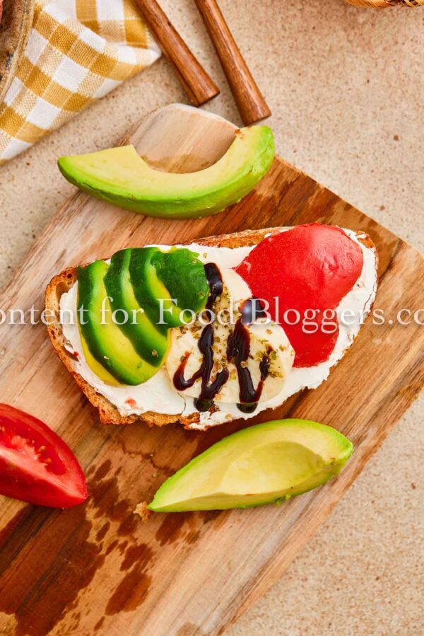 Bread, avocado, fresh mozzarella, tomatoes, cream cheese or ricotta, balsamic glaze, olive oil, salt, black pepper, dried oregano.