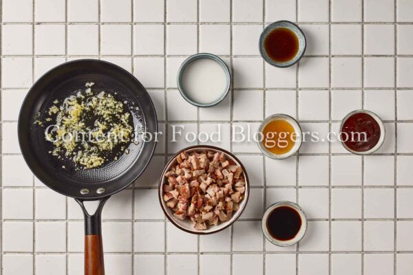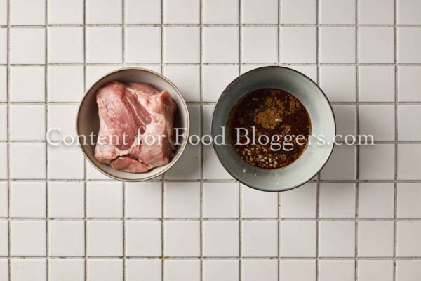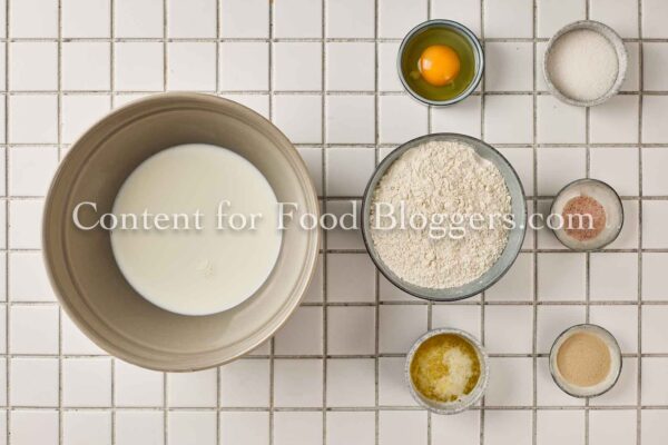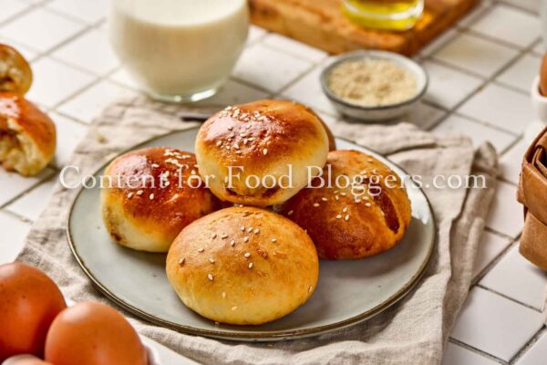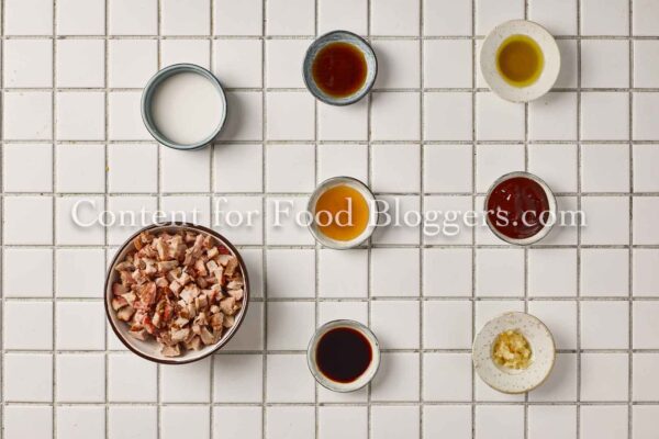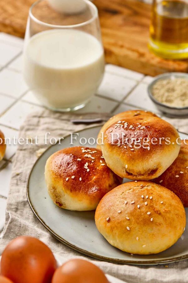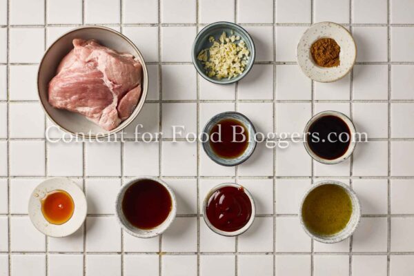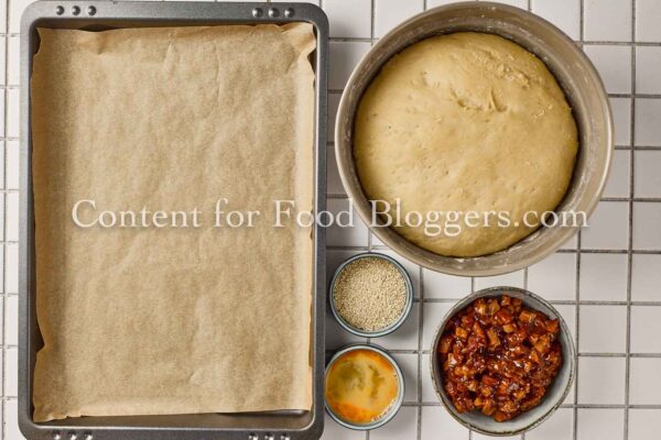 all-purpose flour, sugar, yeast, milk, egg, butter, pork shoulder or pork belly, soy sauce, hoisin sauce, oyster sauce, honey, Shaoxing wine, five-spice powder, garlic, sesame oil, cornstarch, water, sesame seeds