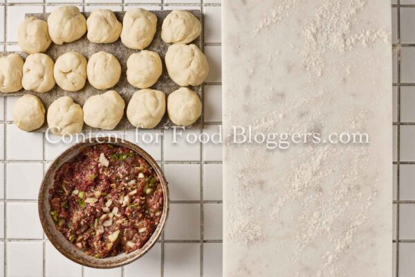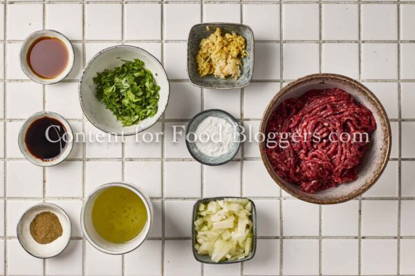 all-purpose flour, water, salt, vegetable oil, ground beef, white onion, garlic, ginger, soy sauce, oyster sauce, black pepper, cornstarch, fresh cilantro