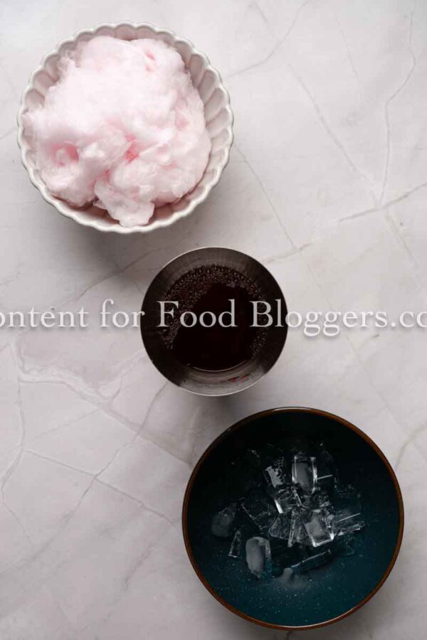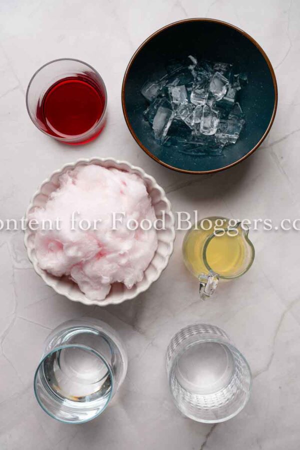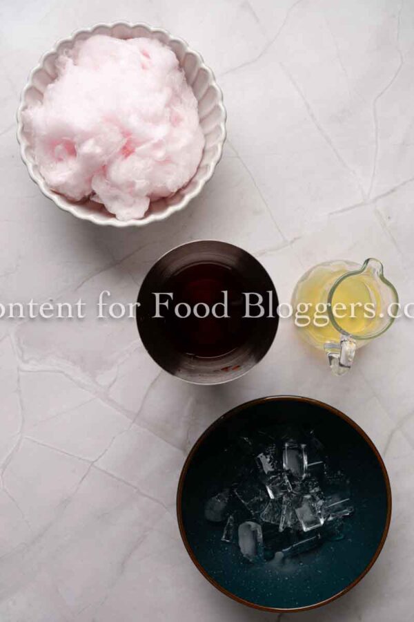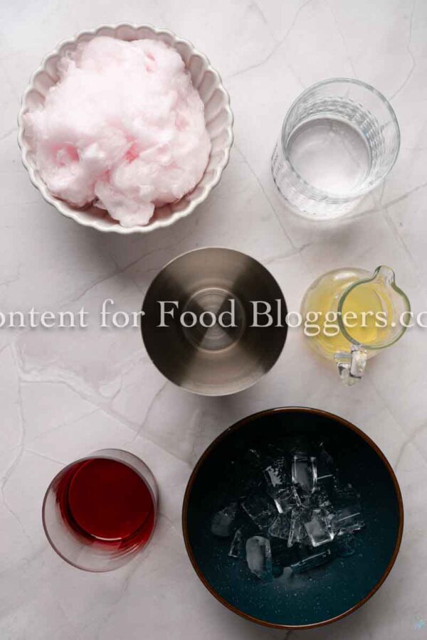Vanilla-flavored vodka, berry-flavored simple syrup, lemon, sparkling water, pink cotton candy, and ice.