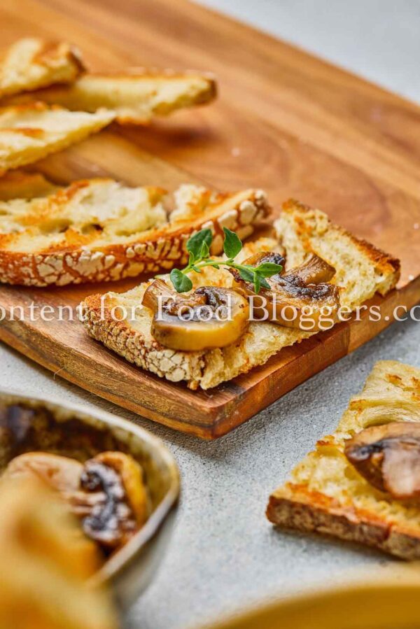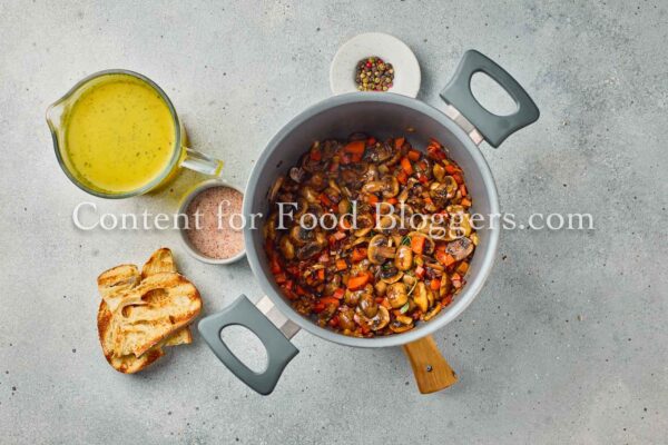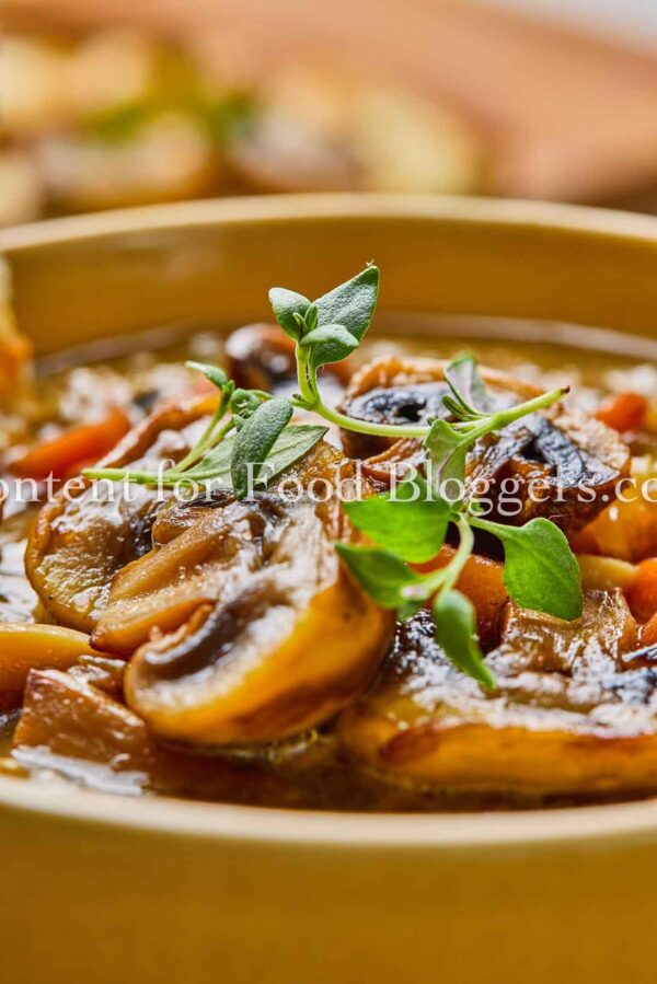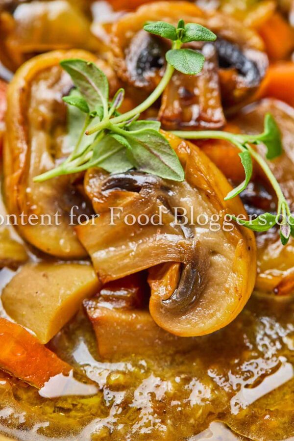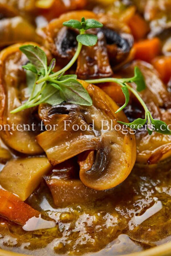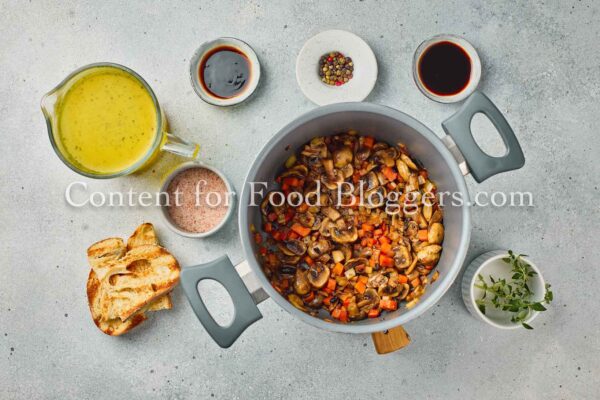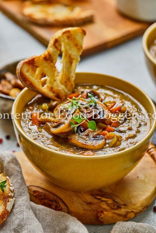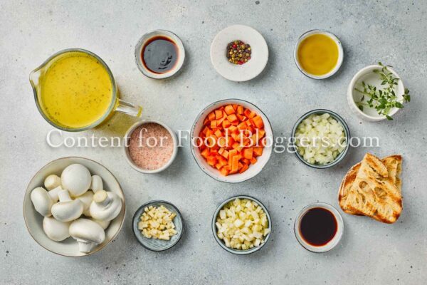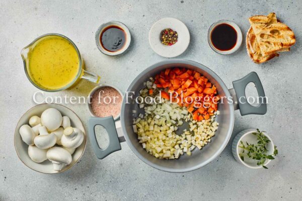 mushrooms, onion, garlic, celery, carrot, vegetable broth, olive oil, soy sauce, balsamic vinegar, thyme, salt, black pepper, crusty bread slices
