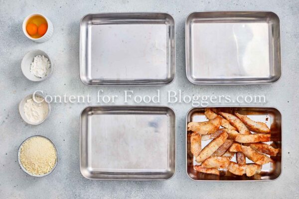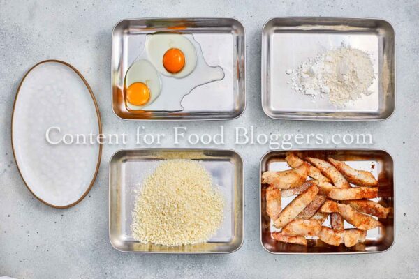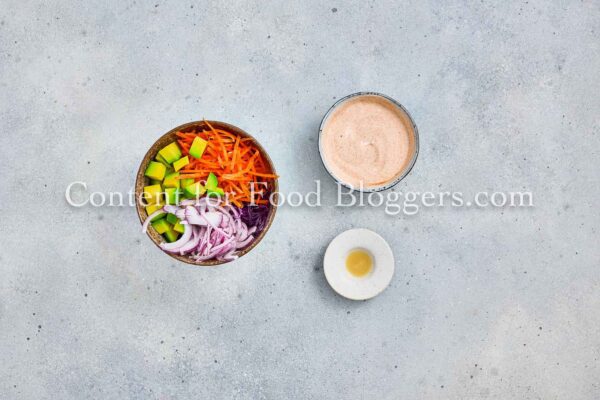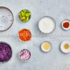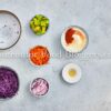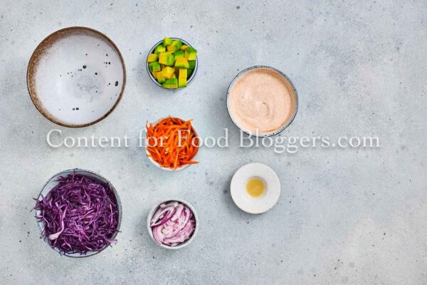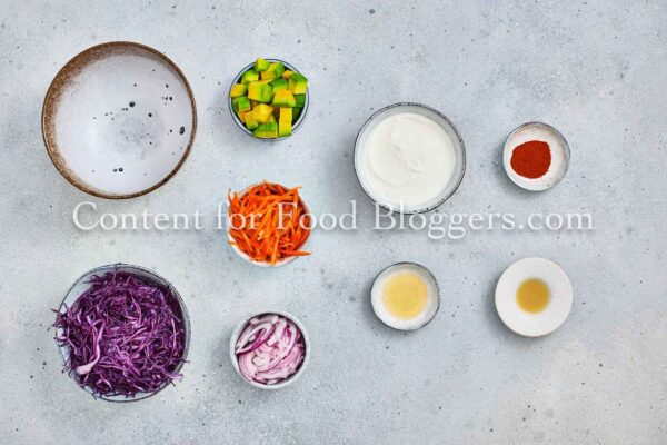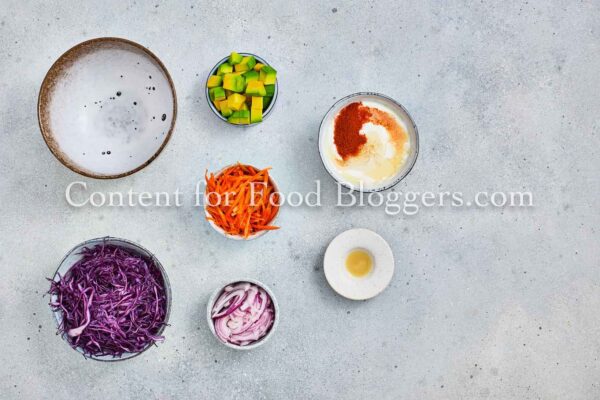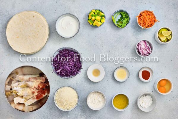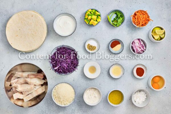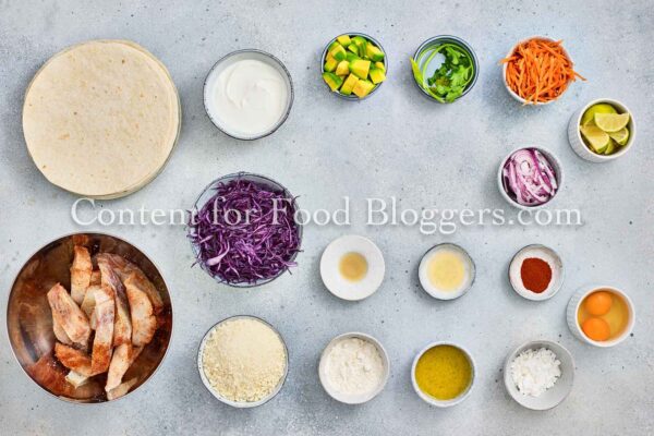 White fish, salt, lemon pepper, smoked paprika, garlic powder, flour, cornstarch, eggs, panko, olive oil, red cabbage, carrot, avocado, red onion, cilantro, lime juice, Greek yogurt, and honey.