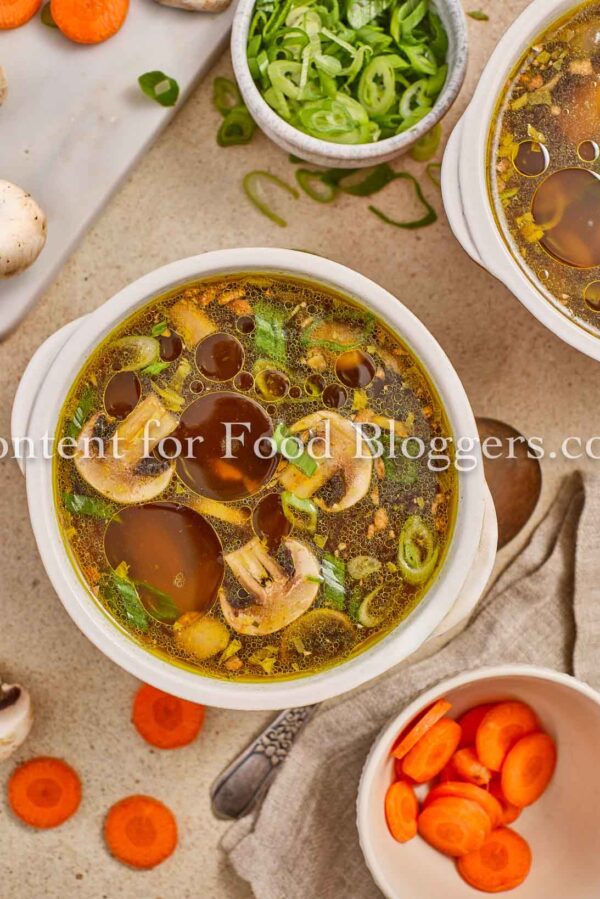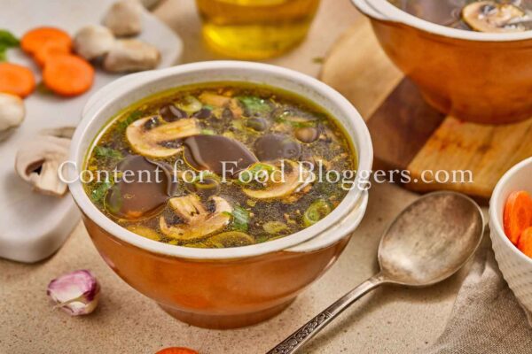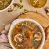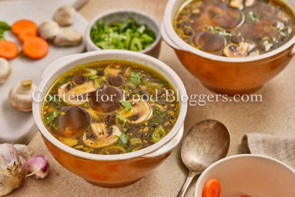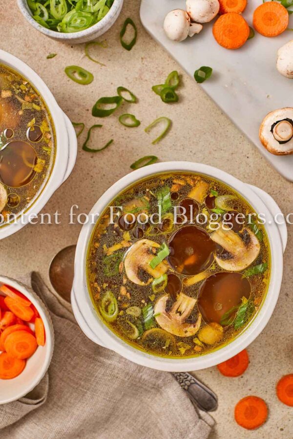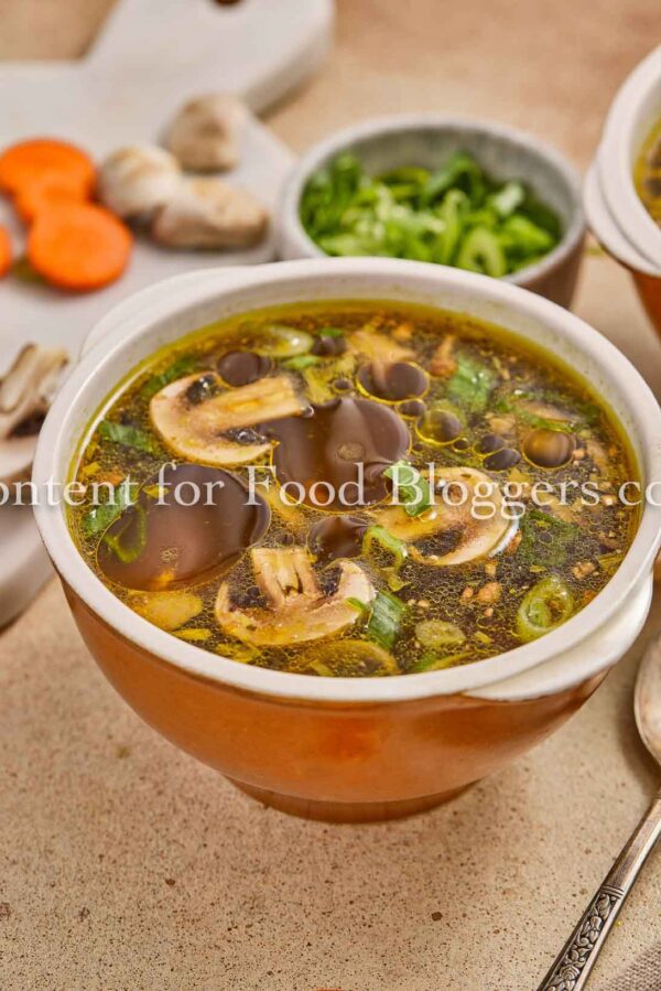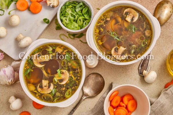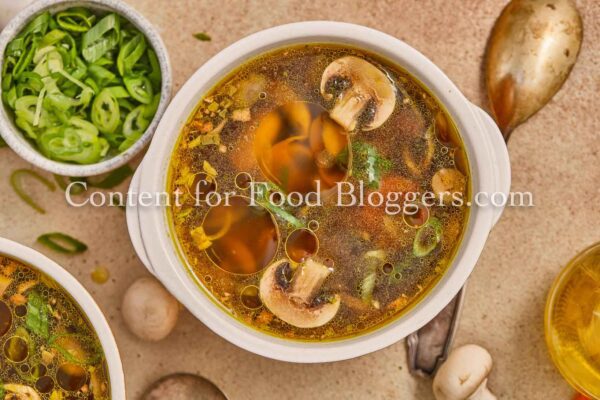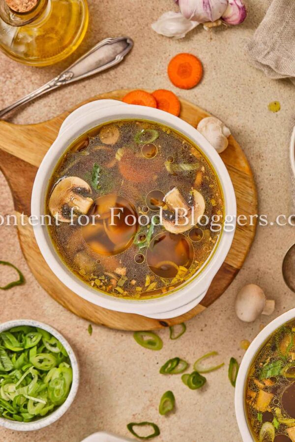 A light, soothing clear soup with a flavorful broth base, tender vegetables, and mushrooms—finished with green onions for freshness. It’s simple, clean, and comforting, making it a perfect starter or easy warm-up meal.