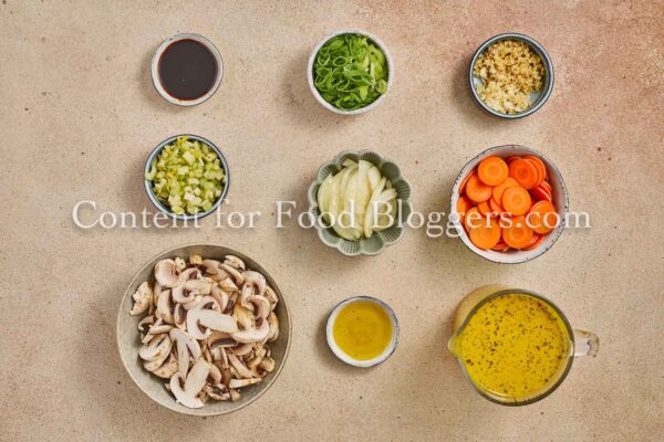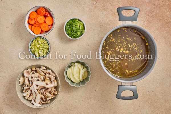 broth, soy sauce, sesame oil, garlic, ginger, onion, carrot, celery, mushrooms, green onions