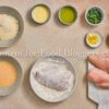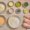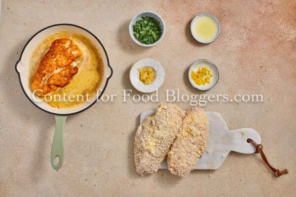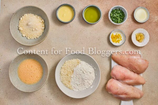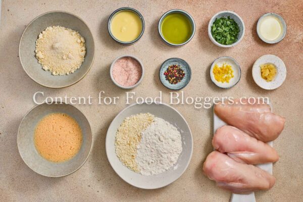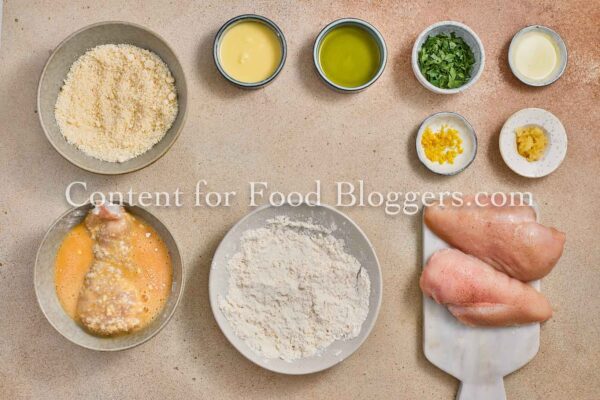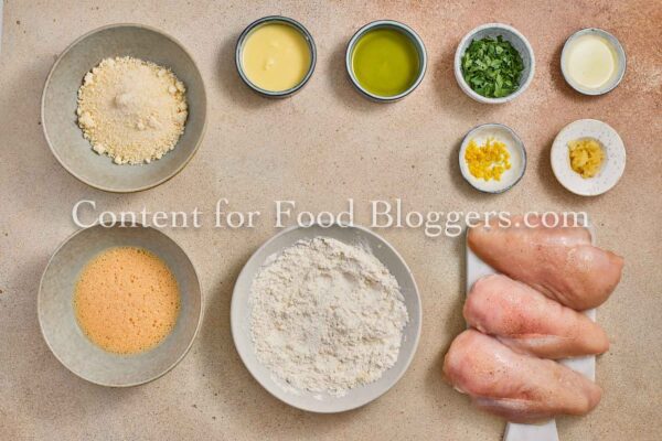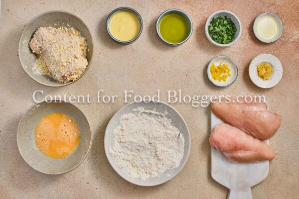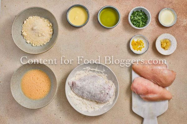 chicken breasts, flour, breadcrumbs, eggs, Romano cheese, garlic, butter, olive oil, lemon, parsley, salt, black pepper