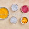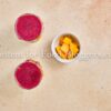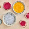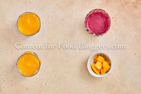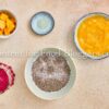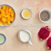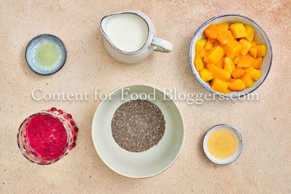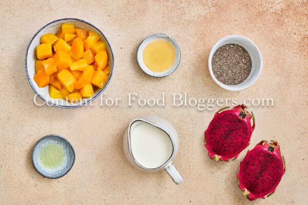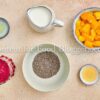 Chia seeds, milk, maple syrup, red dragon fruit, ripe mango, and lemon juice.
