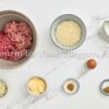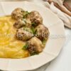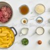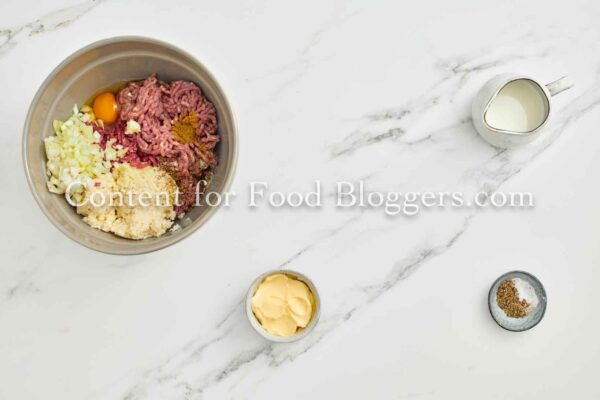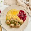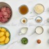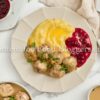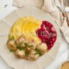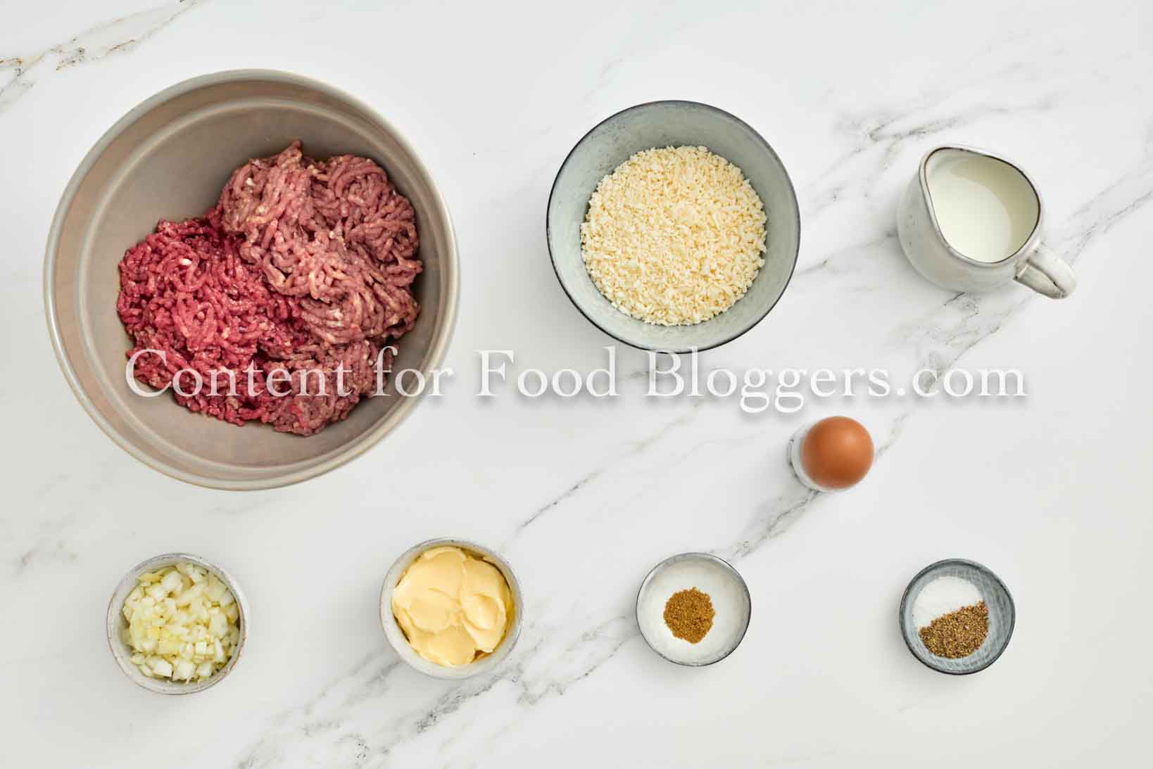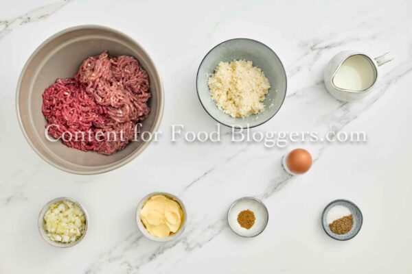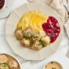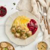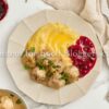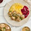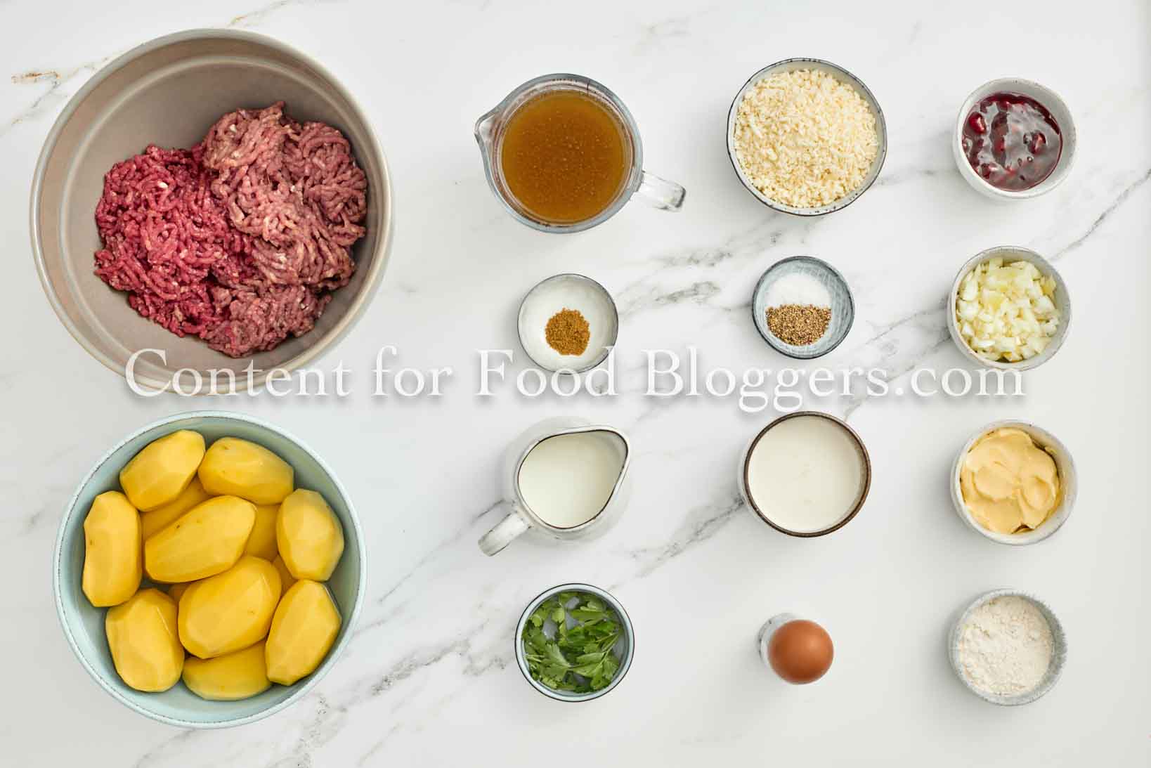 Ground beef, ground pork, breadcrumbs, milk, onion, egg, nutmeg, beef broth, heavy cream, potatoes, butter, and cranberry sauce.