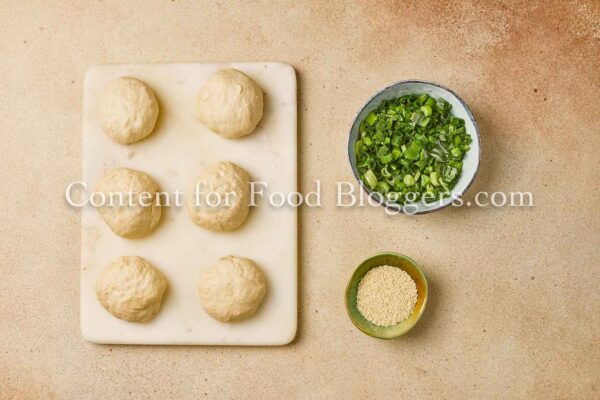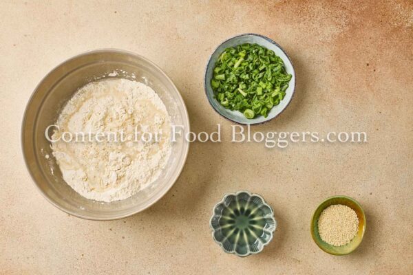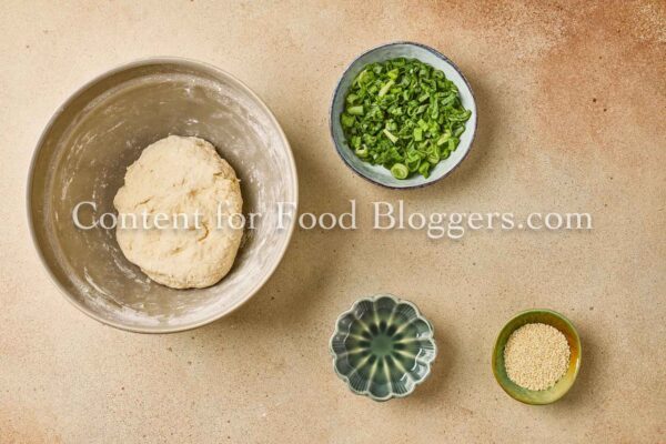 all-purpose flour, active dry yeast, sugar, lukewarm water, sea salt, white pepper, Sichuan peppercorns or five-spice powder, scallions, sesame seeds, neutral oil