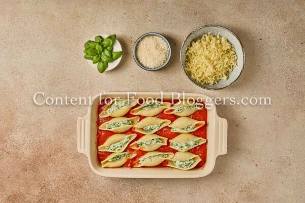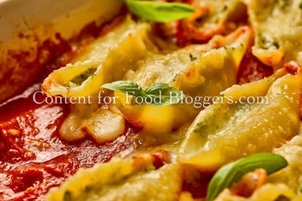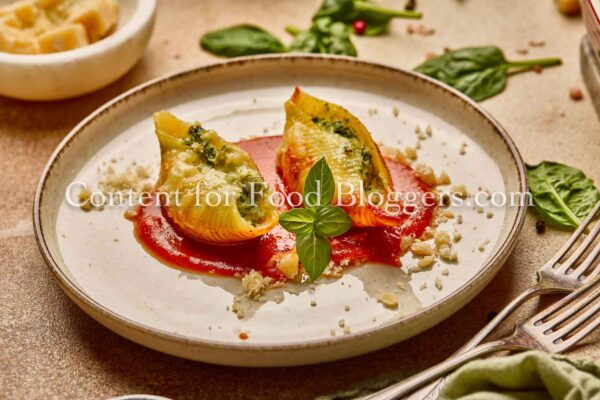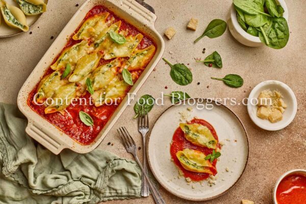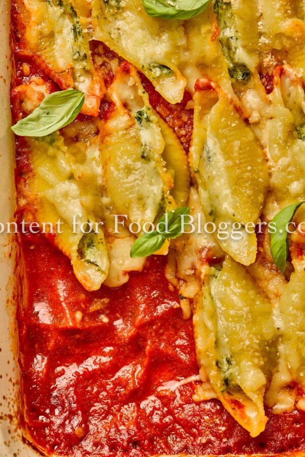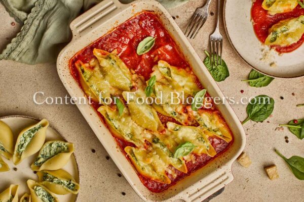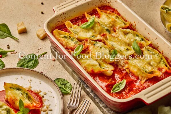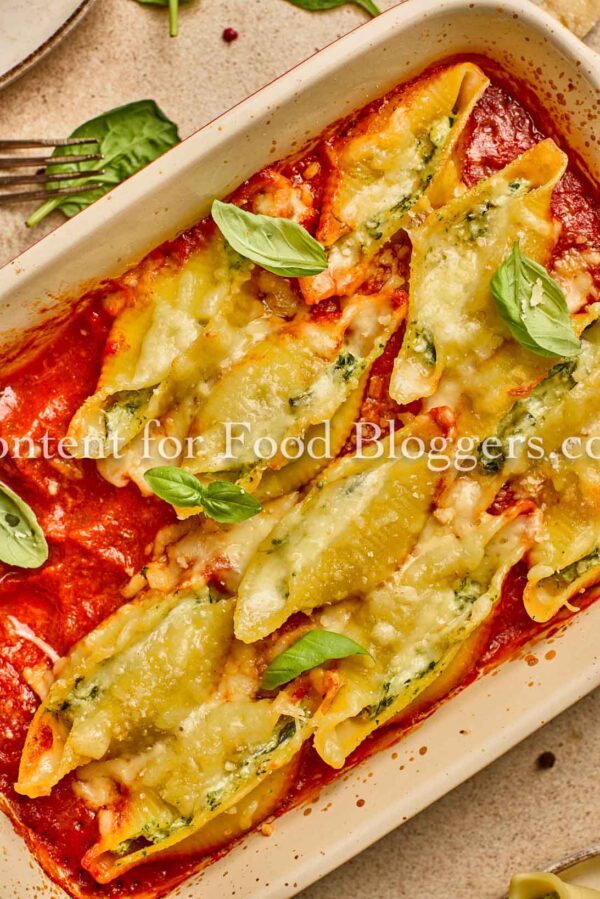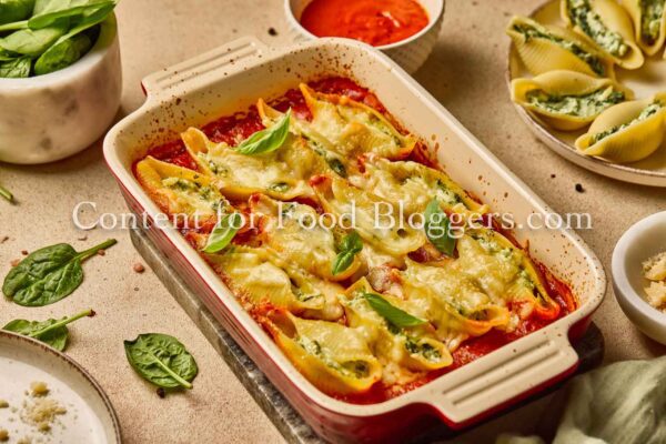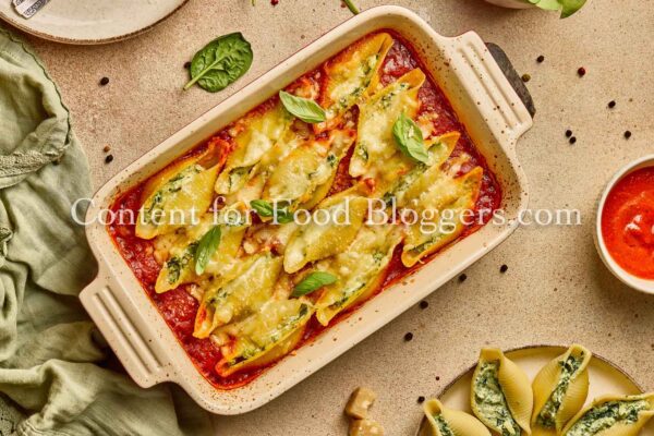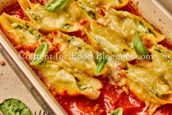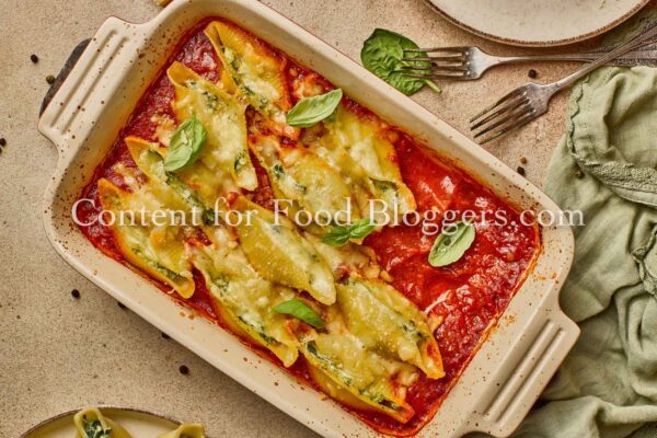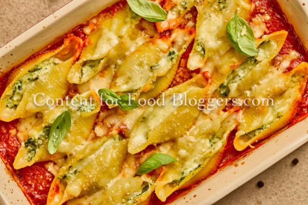 Classic baked stuffed shells filled with a creamy ricotta-spinach mixture, layered with marinara, and finished with a bubbly mozzarella-Parmesan topping. A comforting, crowd-friendly pasta dish that feels restaurant-worthy but simple to prep.