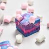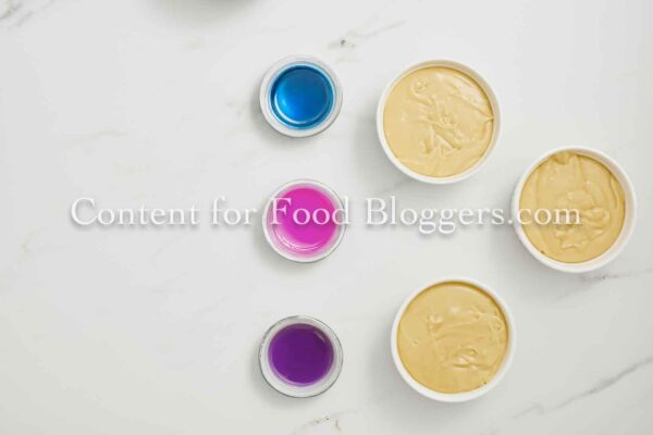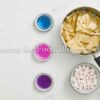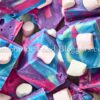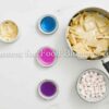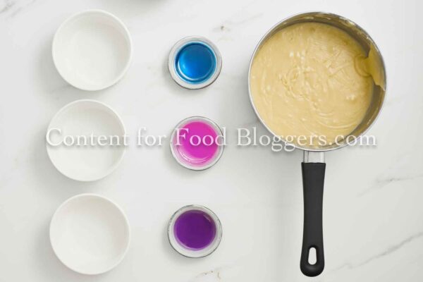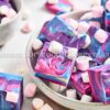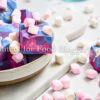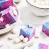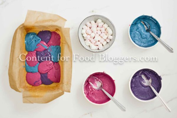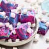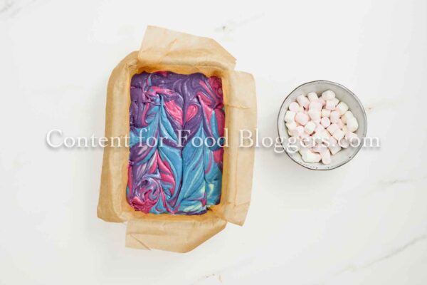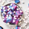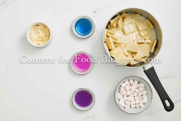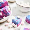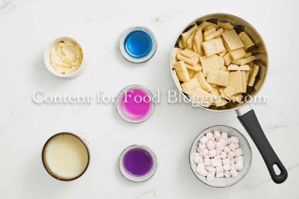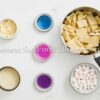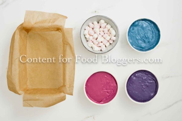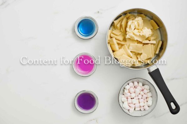 White chocolate, sweetened condensed milk, butter, pink, blue, and purple food coloring, and mini marshmallows.