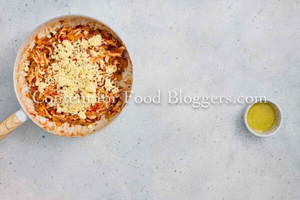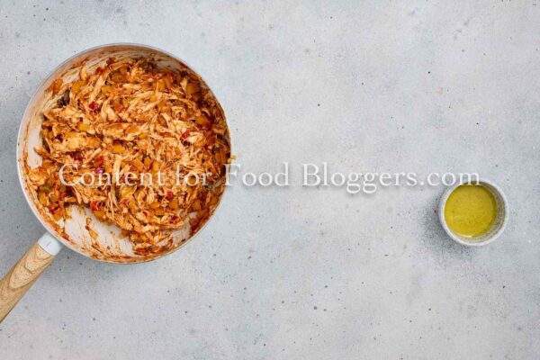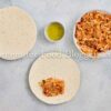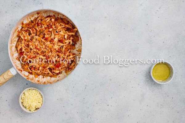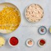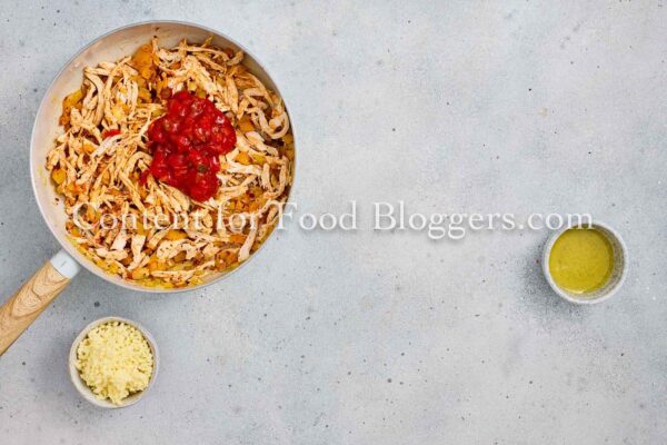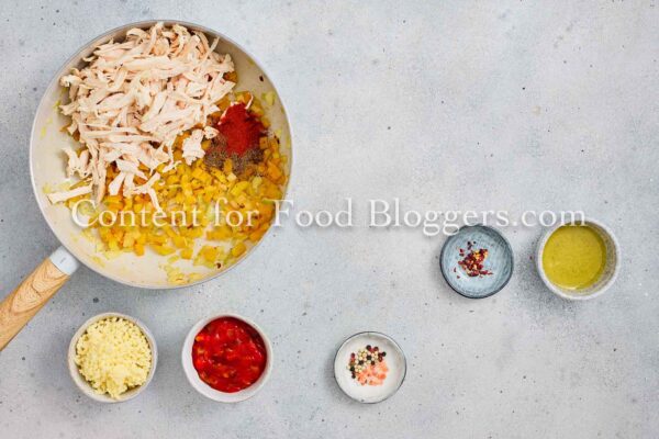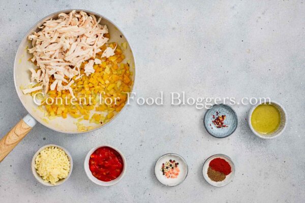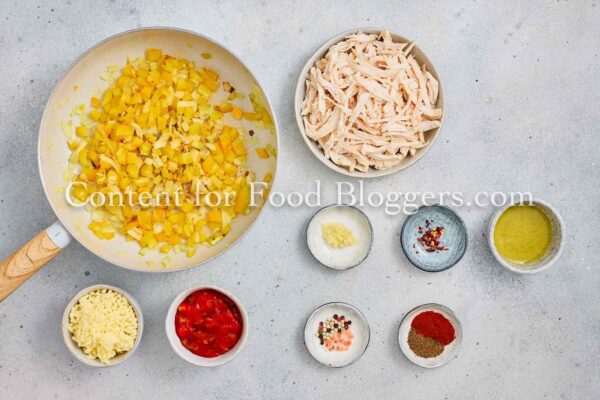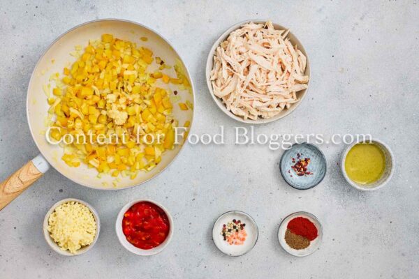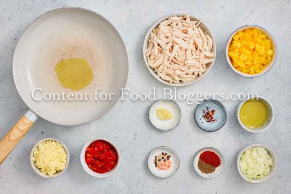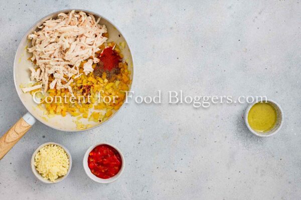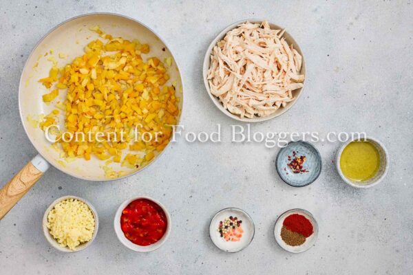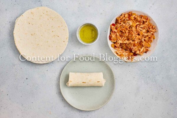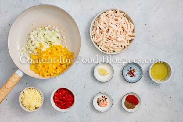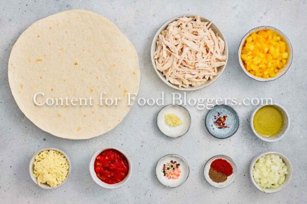 Chicken breast, onion, bell pepper, garlic, vegetable oil, cumin, smoked paprika, chili flakes, salt, black pepper, salsa or diced tomatoes, shredded cheese, flour tortillas, oil.