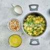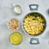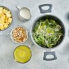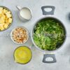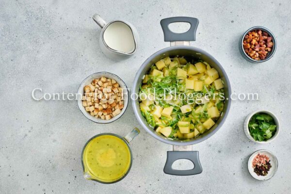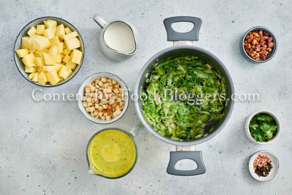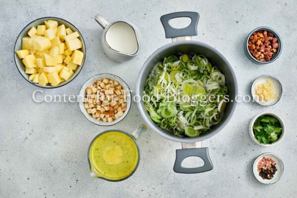 butter, olive oil, leeks, garlic, potatoes, vegetable or chicken stock, milk or cream, salt, black pepper, nutmeg